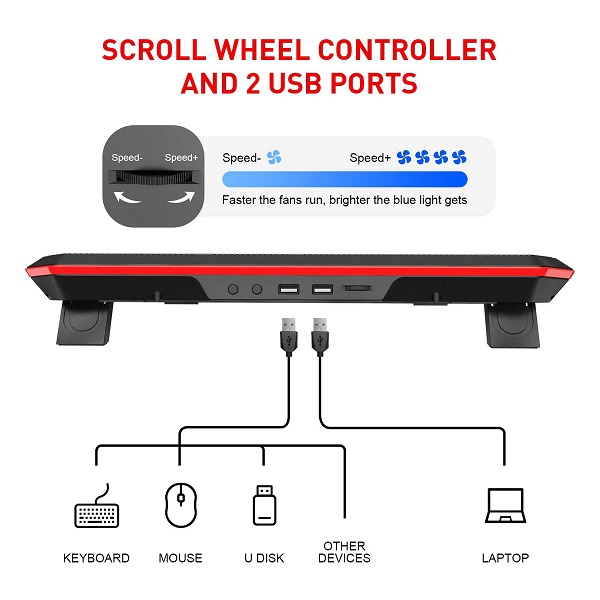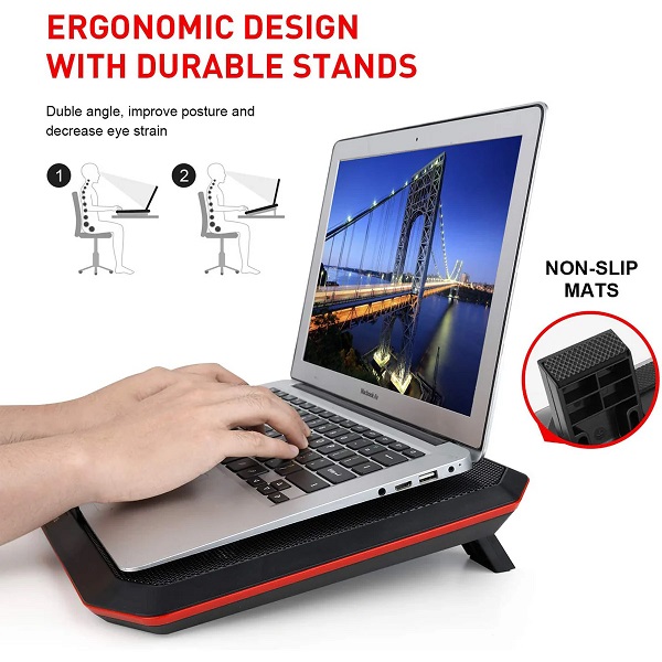 Laptop cooler stand is with two fold-able legs for height settings, allow you to the perfect angle when working or gaming; Built-ed with non-slip baffle, effectively prevent laptop slipping off.